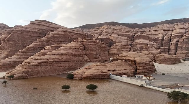 The dam of Shallal village in AlUla Governorate is a water source that seamlessly integrates with the surrounding rock formations, reflecting the diverse natural environment of the region.