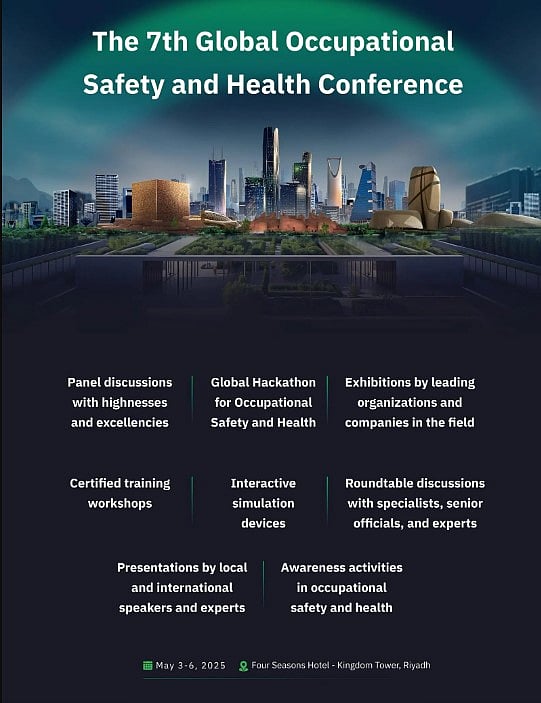 Riyadh will host the seventh edition of the Global Occupational Safety and Health Conference from May 4 to 6, under the patronage of Minister of Human Resources and Social Development and Chairman of the National Council for Occupational Safety and Health Ahmed Al-Rajhi, drawing a wide range of high-ranking officials, experts, and specialists from Saudi Arabia and around the world.