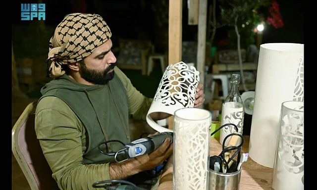 Saudi youth artist Saud Al-Anzi has been sculpting in the heart of his farm in AlUla Governorate for over 15 years. Using Polyvinyl Chloride (PVC) material and recycled wood, he crafts distinctive artistic home lighting fixtures with his unique taste and capabilities. Despite facing a disability in his legs, Al-Anzi continues his sculpting career with unwavering determination and creativity.