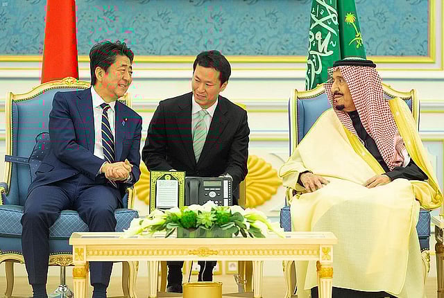 The Custodian of the Two Holy Mosques King Salman binAbdulaziz Al Saud received on Sunday Prime Minister of Japan Shinzo Abe.