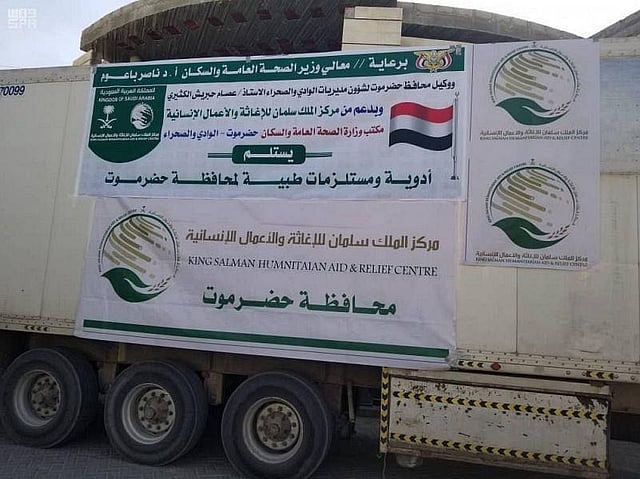 Riyadh-based King Salman Humanitarian Aid and Relief Center (KSrelief) has provided three trucks carrying medical aid weighing 35 tons to the offices of the Ministry of Health in Hadhramaut Governorate, Yemen.