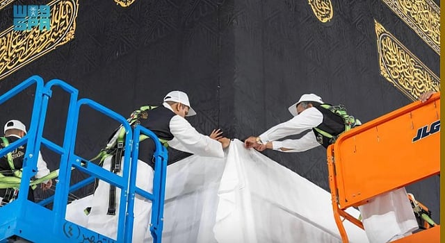 The General Presidency for the Affairs of the Grand Holy Mosque and the Prophet's Holy Mosque continues its efforts to maintain the cleanliness and safety of the Kiswa (cover) of the Holy Kaaba and prevent any tampering with it.