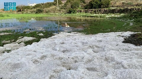 The mountains and plains in Belhamer, Bayhan, and Balsamer north of the city of Abha have transformed into captivating white landscapes due to the falling of hail and moderate to heavy rains on most of the heights in the Asir region.