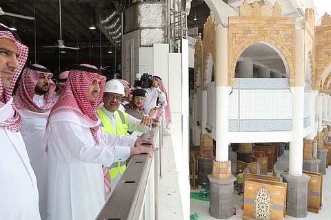 He also checked other facilities—the King Abdul-Aziz Gate, including thecompletion of finishing works, electrical wiring, and water networks. The KingAbdul-Aziz Gate project consists of 5 floors and technical means to help crowdmanagement, 137-meter-long minarets, and instructional screens.