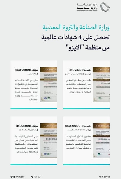 The Ministry of Industry and Mineral Resources received four international certificates from the International Organization for Standardization (ISO), for achieving international quality standards in technology, information security, quality management, and business continuity.