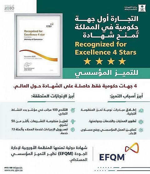 The European Foundation for Quality Management (EFQM) has announced that the Saudi Ministry of Commerce has obtained the "Recognised For Excellence 4 Stars" Certificate.