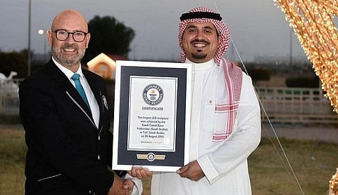 The camel replica, located at the Camel Village of Crown Prince Camel Festival, stands on a steel base against corrosion. It is 10m wide, 4.65m high, and equipped with 51,200 light sources and geometric shapes that make it a prominent landmark and a cultural symbol that enhances the presence of the Kingdom of Saudi Arabia in Guinness World Records.