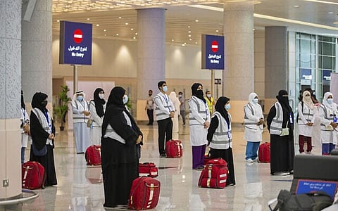 Pilgrims arrive to King Abdulaziz Airport for the Hajj pilgrimage to Mecca, in Jeddah, Saudi Arabia, Saturday, July 25, 2020. (Saudi Ministry of Media via AP)